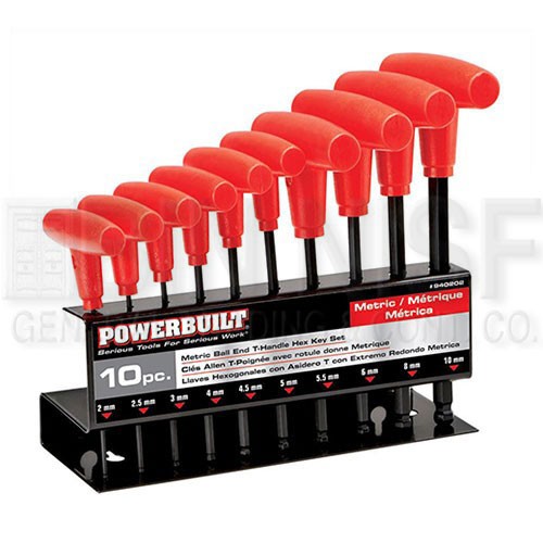 Includes 2mm, 2.5mm, 3mm, 4mm, 4.5mm, 5mm, 5.5mm, 6mm, 8mm and 10mm T-Handle hex key wrenches