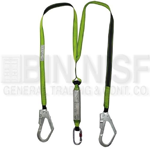 - Twin webbing lanyard fluorescent yellow color, with shock absorber, one-side easy 308 karabiner & two nickel plated scaffoldings with easy sh 60 hook