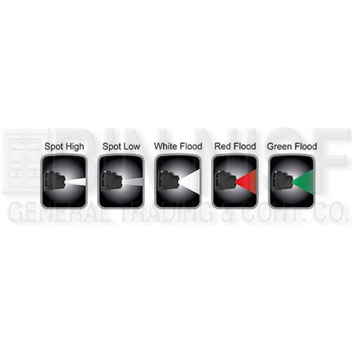 Switch Function: Dual Switches. High/Low-brightness spotlight and white/red/green floodlight