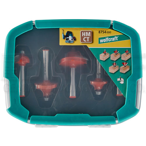 1 semi core box bit, TCT, Ø 22 x 9.5 mm, r 6.5 mm 1 chamfering cutter, TCT, Ø 31 x 12.5 mm, 45° 1 round-over bit, TCT, Ø 25 x 11 mm, r 6.5 mm 1 round-over bit, TCT, Ø 31 x 16 mm, r 9.5 mm 1 profile cutter, TCT, Ø 38 x 19 mm, r 6.5 mm |