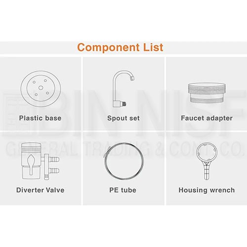 Plastic base, Spout set, Faucet adapter, Diverter valve, PE tube, Housing wrench |