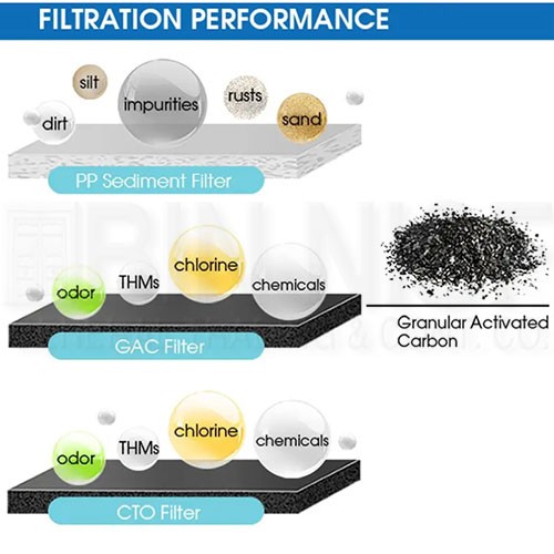 1st stage: 5uPP sediment filter 2nd stage: GAC carbon filter 3rd stage: CTO carbon block filter |